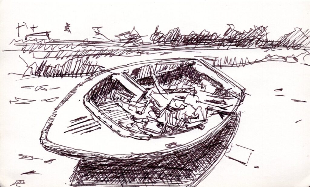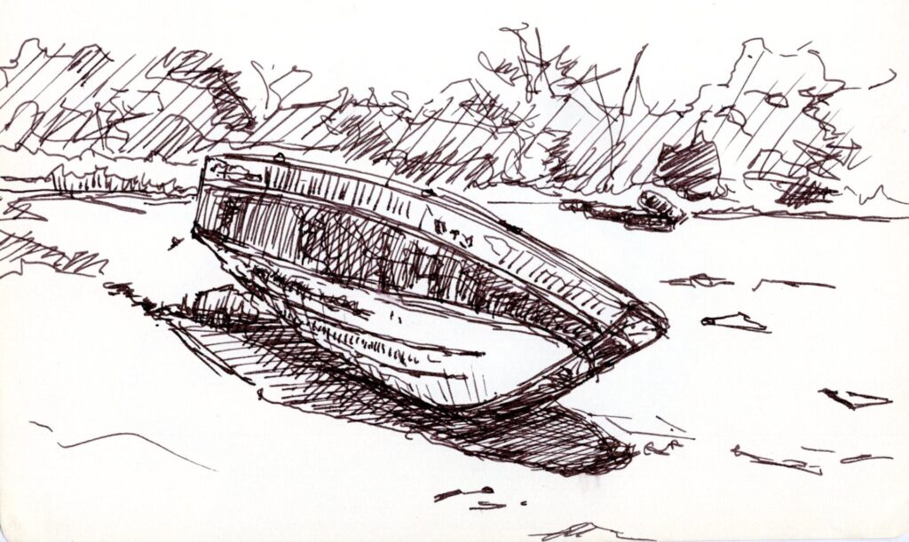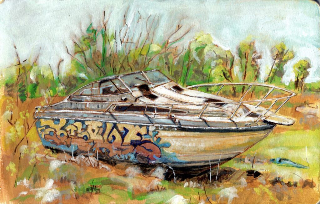 “Starboard View of a Boat Filled with Garbage in Abandoned Lot Down the Road”, gouache on paper, 2024