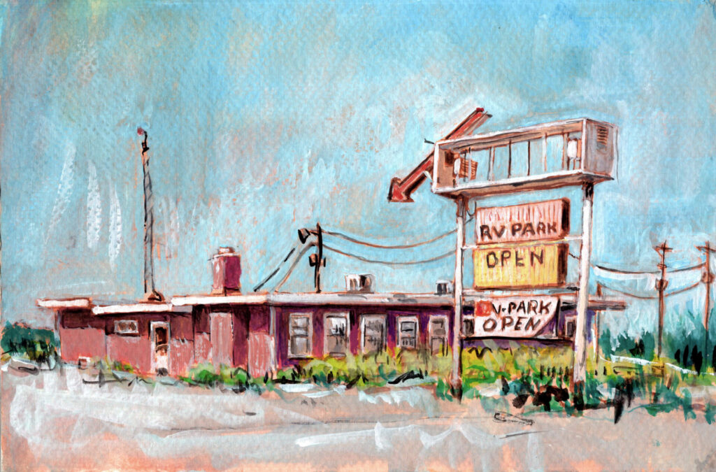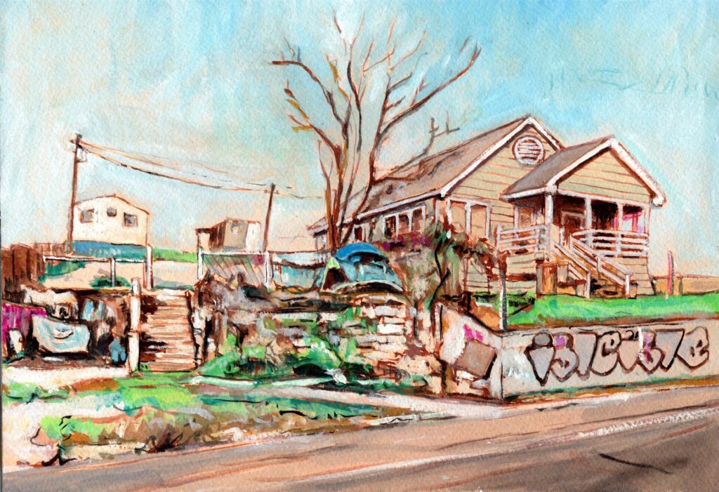 “7th Street Tent and House Before they Built the Apartments” gouache on Arches paper 7 by 10 inches 2025