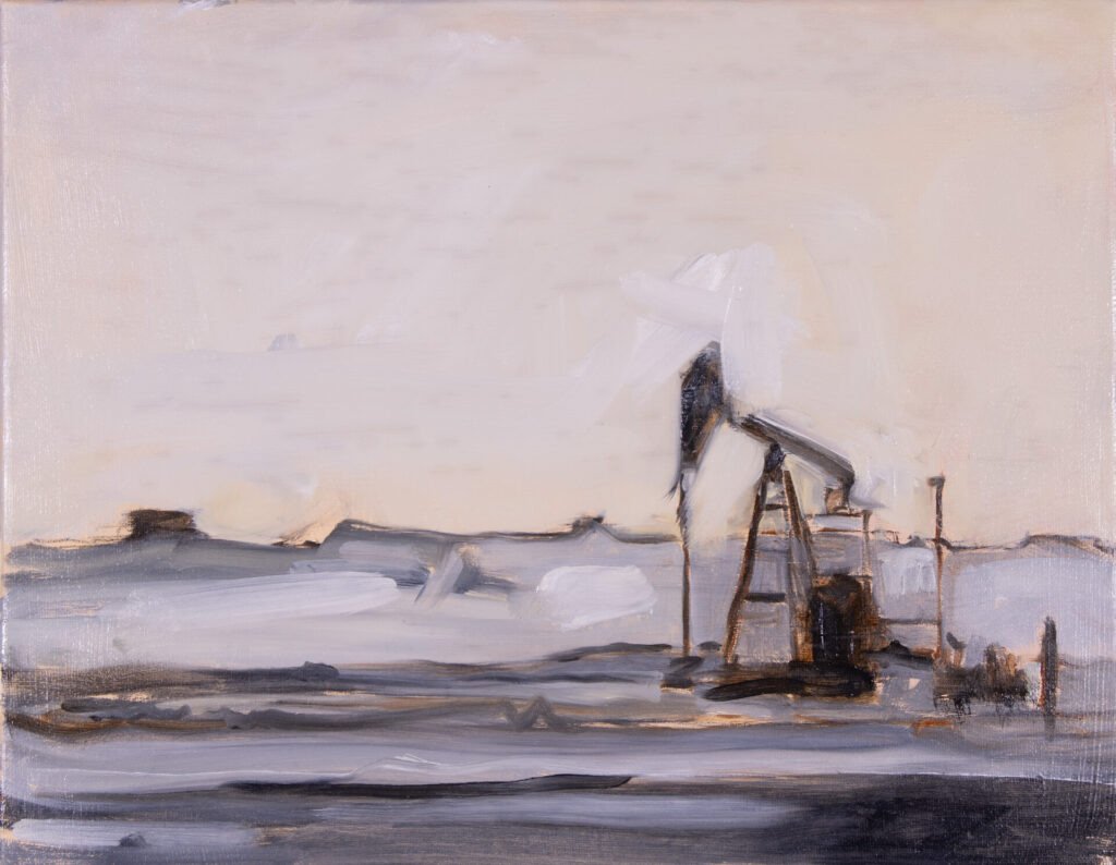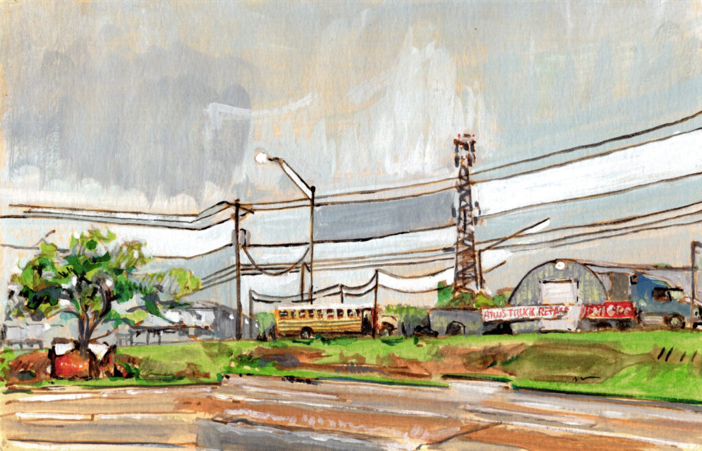 Morning Fog at Onion Creek Looking Toward Sewer Treatment Plant, and Tesla Factory, gouache on paper, 4 by 6 inches, 2025