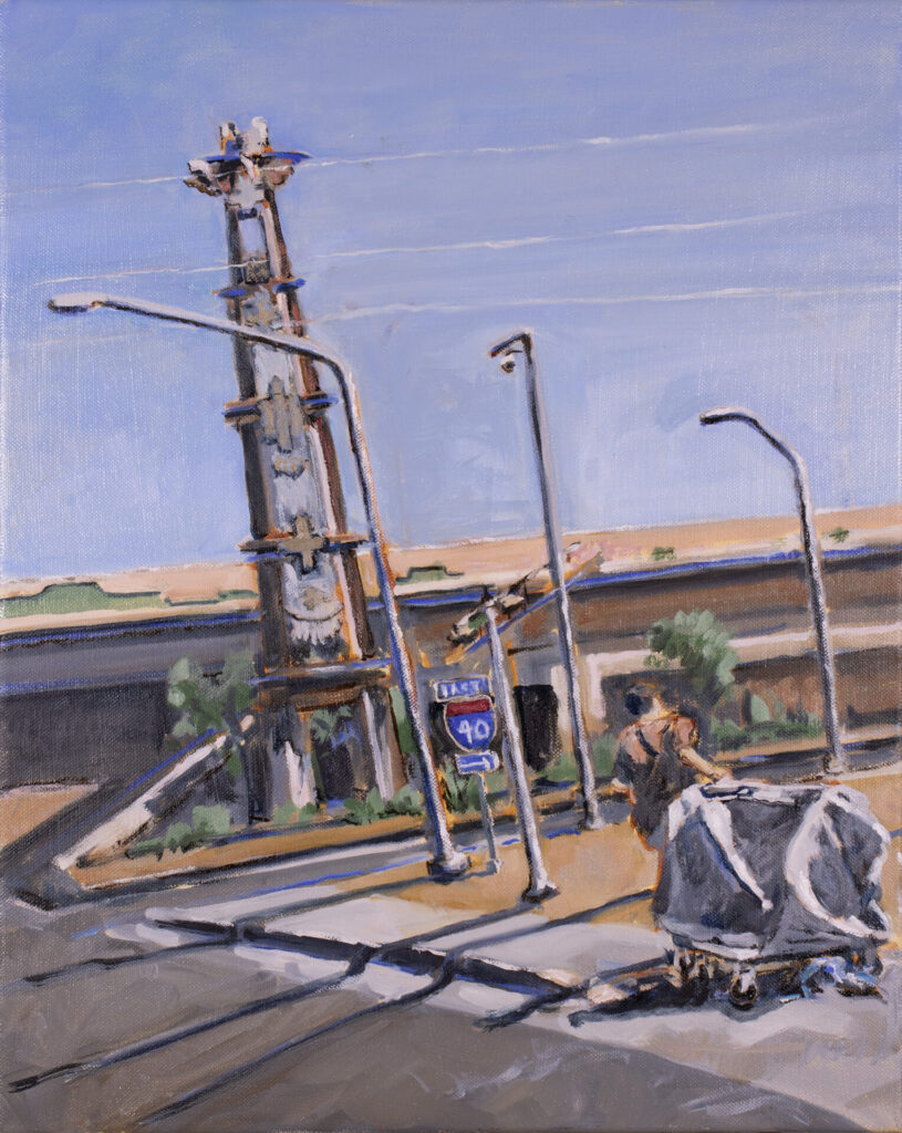 Infrastructure Project is a series of work inspired by observations of ephemeral structures like tents, makeshift roadside camps, and unused or abandoned buildings people make homes in and their contrast with large infrastructure features. It is a meditation on our society and its priorities and an exercise in “seeing” and visually exploring these transient “unseen” people and things found in the shadow of extremely costly and durable infrastructure works, local landmarks, and luxury buildings. 2023 – 2025