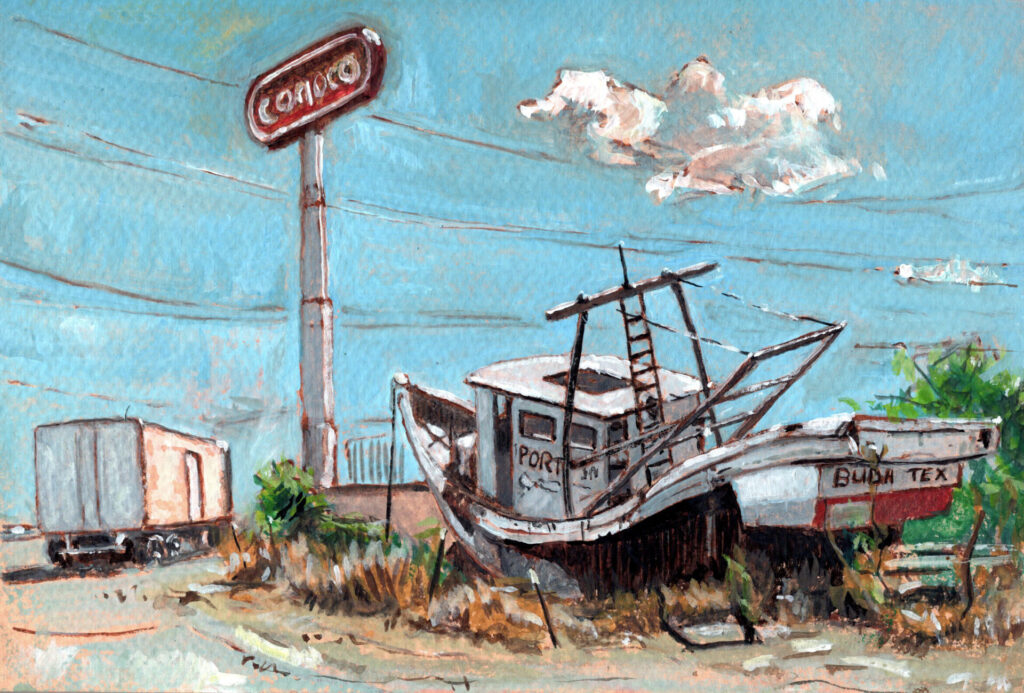 “Port View of a Boat Filled with Garbage in an Abandoned Lot Near the F1 Racetrack Down the Road”, gouache on paper, 2024